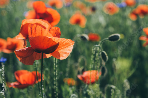Obraz premium Red poppy flowers blooming in the green grass field, floral natural spring...