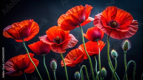© Man888, Obraz premium Red Poppy Flowers on Black Background - Elegant Floral Portrait Photography