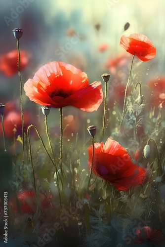 Obraz premium Red poppy flowers on the summer meadow, watercolor painting.