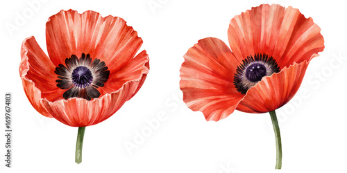 © Victoria, Obraz premium Red poppy flowers with black centers on a transparent background