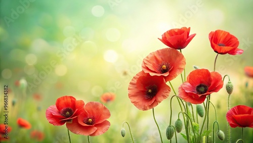 © methinee, Obraz premium Red poppy flowers with blossom on a pale green backdrop