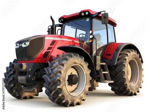 © Natanong, Obraz premium Red Powerful Agricultural Tractor on White Background for Farming and Cultivation