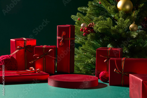 Fototapeta premium Red presents and Christmas ornaments are arranged on a green table with a tree behind them. The simple layout and soft lighting create a charming holiday setup for design use.