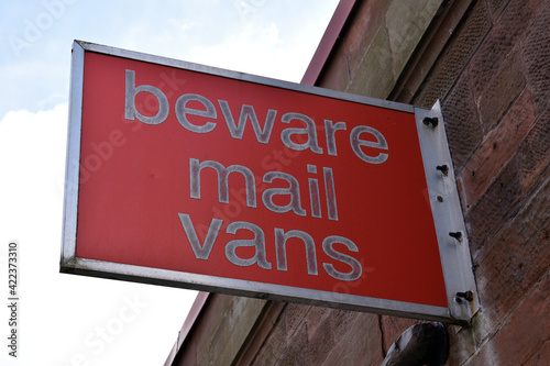 © eyepals, Obraz premium Red Public Warning Sign on Exterior Wall of Industrial Building