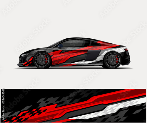 © Wrapin, Fototapeta premium Red Racing Car Wrap – Shattered Effect with Checkered Flag Graphics