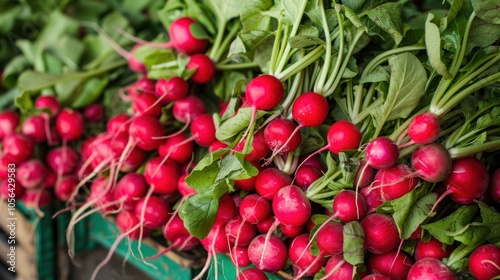 © Gajah, Obraz premium red radishes in bunches on the market stand,