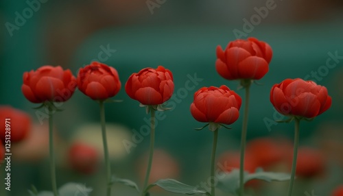 © Ilja, Obraz premium Red Ranunculus Flowers in Bloom, Soft Focus Background Creates Dreamy Green Garden Setting