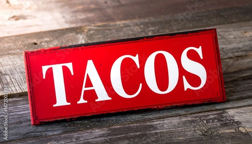 © Aodne, Fototapeta premium Red rectangular sign on wood reads "Tacos" in white lettering