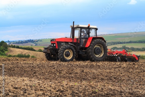 Fototapeta premium Red retro tractor on the field during autumn work, on the background of the...