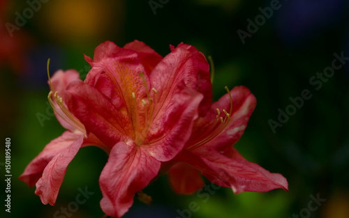 Fototapeta premium red rhododendron flower on dark green background