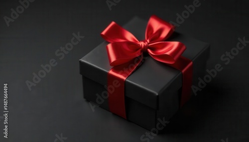 © Prasert, Obraz premium Red ribbon atop black gift box, black background, dark, texture, photography