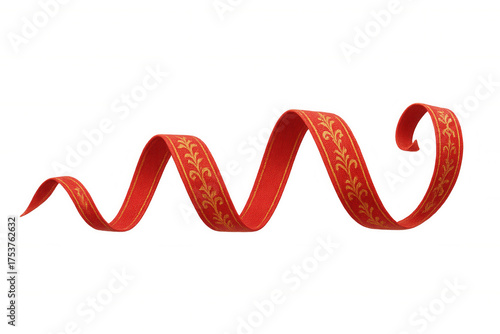 Fototapeta premium Red ribbon with golden floral pattern swirling, decorative textile element for celebration and gift design