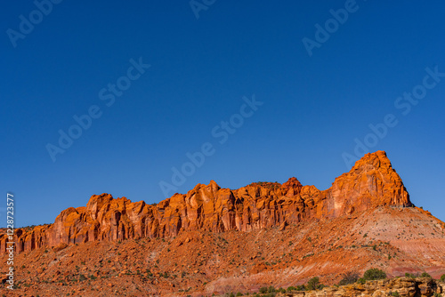 Naklejka premium red rock cliffs at the bottom and a large deep blue sky with lots of room for copy