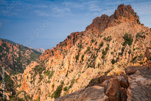 Fototapeta premium Red rocks of Calanques de Piana are under blue cloudy sky, Corscia
