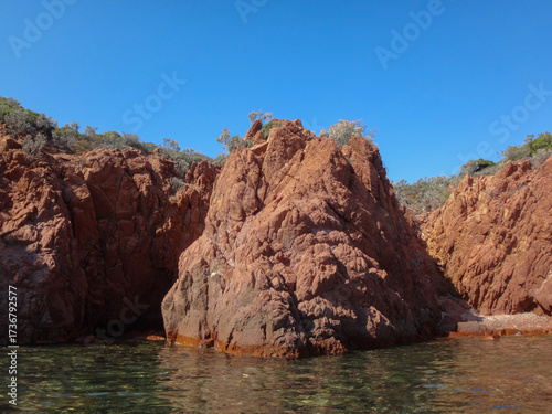 © CAM's, Fototapeta premium Red Rocky Cliffs Rising Above Clear Coastal Waters