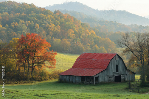 © kristina, Obraz premium Red-roofed barn in field.