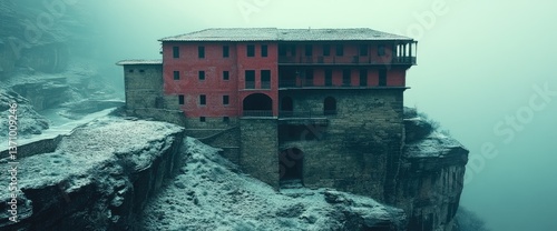 Naklejka premium Red-roofed building sits atop a rugged cliff shrouded in mist, blending...