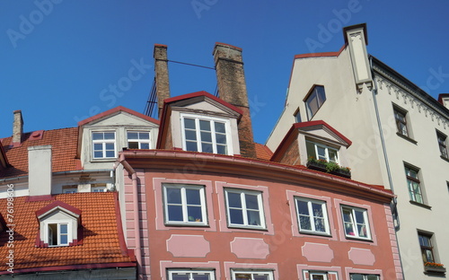 © Juulijs, Fototapeta premium Red roofs, dormers and chimneys (Riga, Latvia)