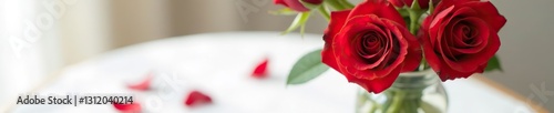 Fototapeta premium Red rose blooms in a vase on white tablecloth, botanical, petals