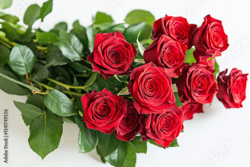 © sahruddin, Obraz premium red rose bouquet with fresh green leaves, on white background
