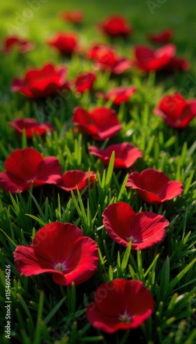 Fototapeta premium Red rose petals scattered on a bed of soft green grass, floral, foliage