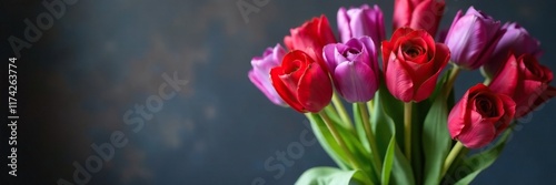 © Temteen, Fototapeta premium Red rose stems entwined with purple tulip bunches in a vase, arrangement, nature, flowers