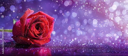 Fototapeta premium Red rosebud on a sparkling purple background Copyspace