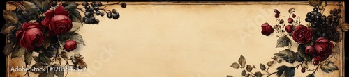 © Alexey, Fototapeta premium Red Roses and Black Berries on Antique Paper with a Classic Border Design. Generative AI