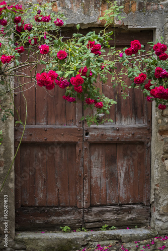 © Daan, Fototapeta premium Red Roses and Old Door in Mombaldone, Piedmont