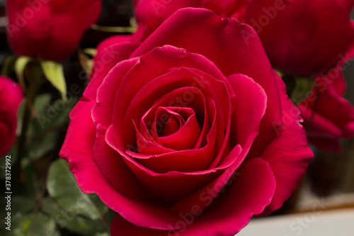 © binhdd, Fototapeta premium red roses and white card with a place for a congratulatory text on a black background