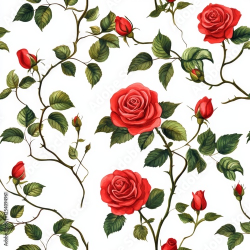© adri, Fototapeta premium Red roses climbing vines seamless pattern textile design