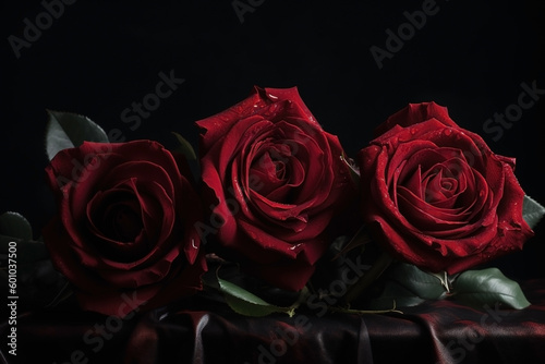 © Artem, Fototapeta premium Red roses dark moody romantic background. Close-up flowers card backdrop. Ai generated