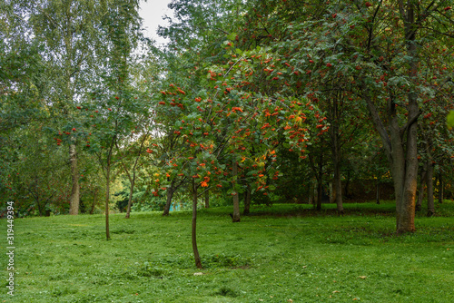 © Andrey Nikitin, Naklejka premium Red rowan is selectively lit by the setting sun in the Park