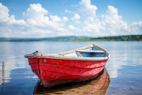 © King, Naklejka premium Red Rowboat on Calm Lake