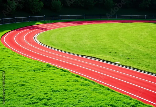 © chanwut, Obraz premium Red running track curves around a green field, athletic track, game