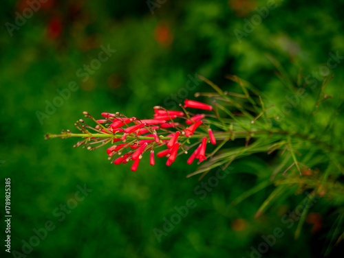 © Tavan, Fototapeta premium Red Russelia Equisetiformis Firecracker Plant Tubular Flowers Blooming on Green Background Bokeh