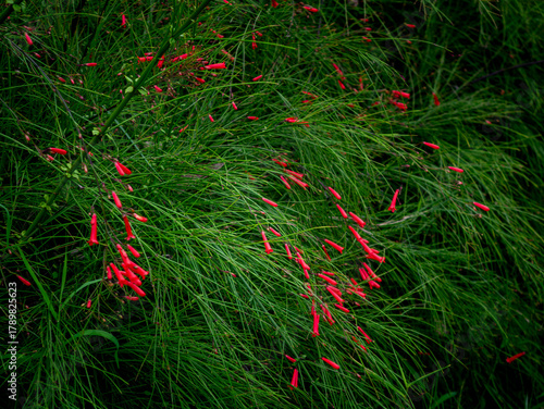 © Tavan, Fototapeta premium Red Russelia Equisetiformis Firecracker Plant Tubular Flowers Blooming on Green Background Bokeh