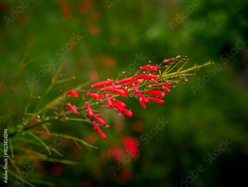 © Tavan, Fototapeta premium Red Russelia Equisetiformis Firecracker Plant Tubular Flowers Blooming on Green Background Bokeh