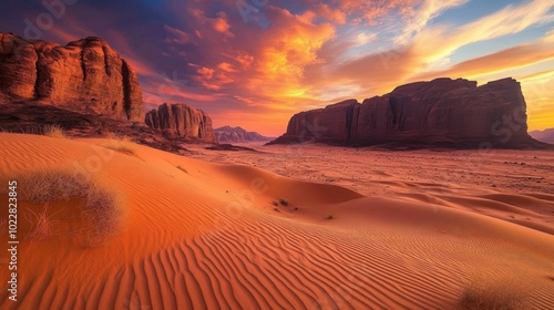 © Ali, Naklejka premium Red sand dunes under dramatic sunset sky.