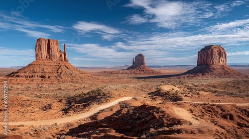 © Oleksandr, Fototapeta premium Red sandstone buttes rise majestically from the arid desert floor under a brilliant blue sky. A road winds through the iconic landscape.