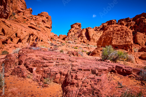 © Nicholas J. Klein, Fototapeta premium Red Sandstone Formations and Desert Shrubs under Blue Sky Moapa Valley