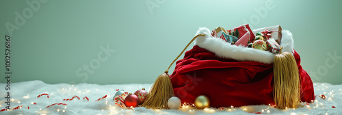 Fototapeta premium Red Santa Bag Filled with Christmas Gifts and Ornaments