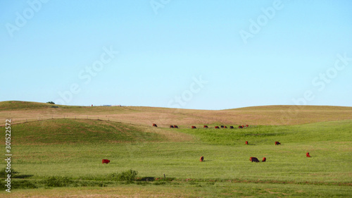 © Aleksas Kvedoras, Obraz premium Red Scottish cows graze in a green meadow
