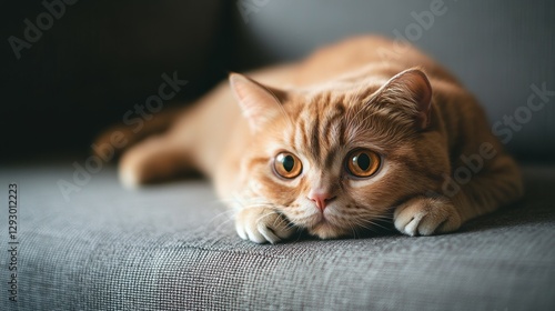 Obraz premium Red Scottish Fold cat rests on a grey sofa, embodying calm and comfort in a...