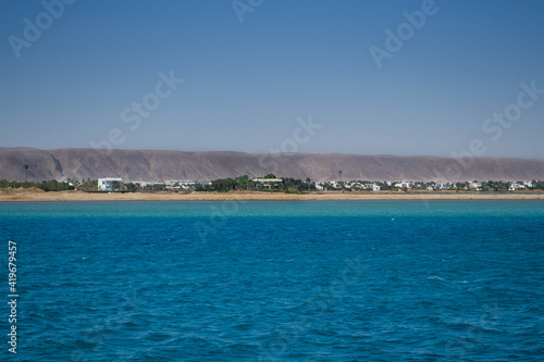 Fototapeta premium Red sea coral reef and blue sky. El Gouna, Egypt