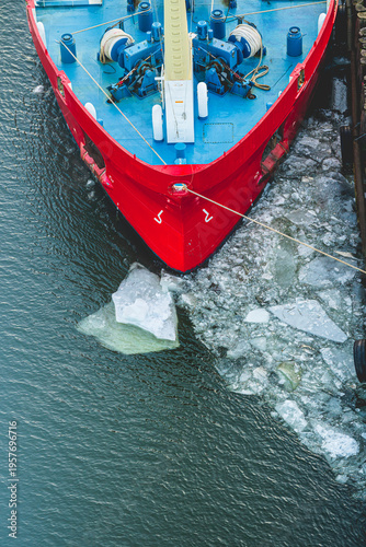 © Trygve, Fototapeta premium Red ship bow docked in icy harbor during cold winter evening.