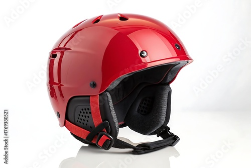 © hid, Fototapeta premium Red Ski Helmet with Glossy Surface and Chin Strap