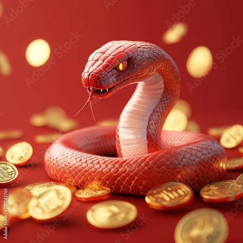 © Graphic Dude, Fototapeta premium Red snake surrounded by gold coins Chinese New Year symbol wealth prosperity good luck fortune zodiac animal reptile 3D render digital art illustration red background festive celebration traditional