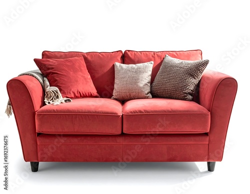 Fototapeta premium Red sofa with throw pillows and blanket