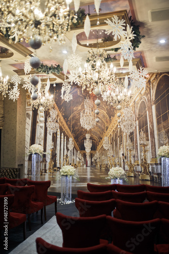 Obraz premium Red soft chairs stand in the rows before wall with picture of luxury corridor...